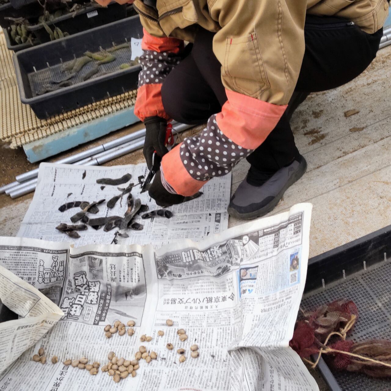 茨城県の自社農園で栽培したのち十分に乾燥させ、1粒1粒、手作業で脱穀した貴重な豆をお届けします。